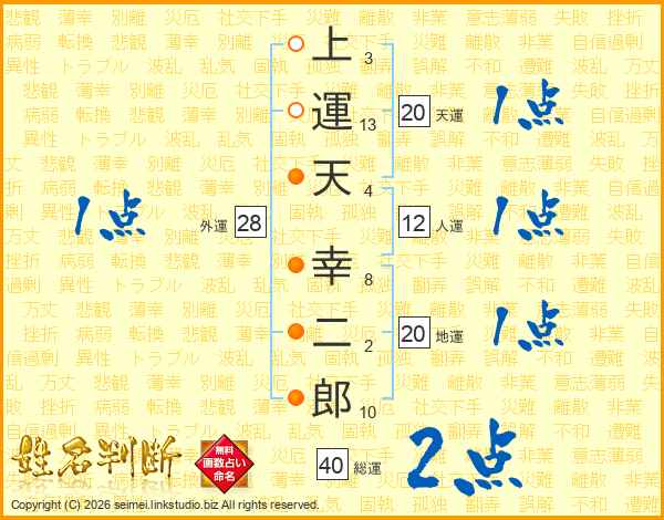 上(3画)運(13画)天(4画) 幸(8画)二(2画)郎(10画)
