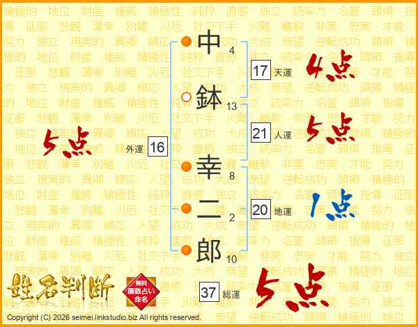 中(4画)鉢(13画) 幸(8画)二(2画)郎(10画)