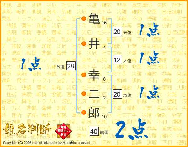 亀(16画)井(4画) 幸(8画)二(2画)郎(10画)