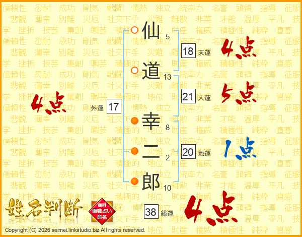仙(5画)道(13画) 幸(8画)二(2画)郎(10画)