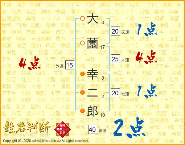大(3画)薗(17画) 幸(8画)二(2画)郎(10画)