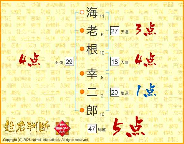 海(11画)老(6画)根(10画) 幸(8画)二(2画)郎(10画)