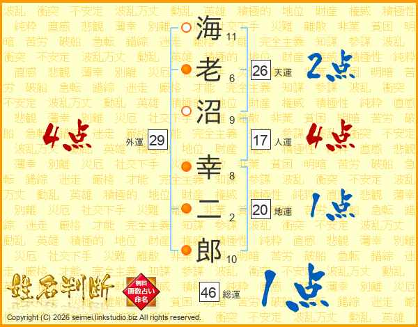 海(11画)老(6画)沼(9画) 幸(8画)二(2画)郎(10画)