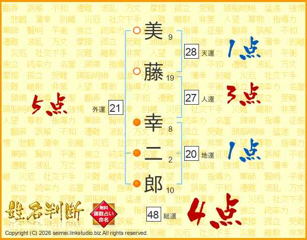 美(9画)藤(19画) 幸(8画)二(2画)郎(10画)