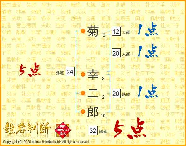 菊(12画) 幸(8画)二(2画)郎(10画)