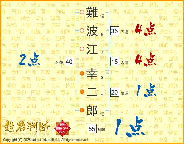 難(19画)波(9画)江(7画) 幸(8画)二(2画)郎(10画)