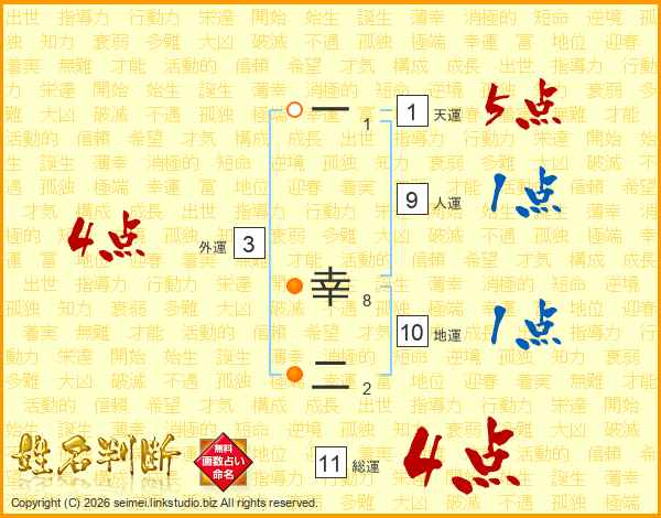 生活面を象徴する運勢です。外部から受ける影響力を表し、結婚運、家庭運や職場、環境への順応性を表します。総運から人運を引いた画数。姓や名が1文字の場合を除く。