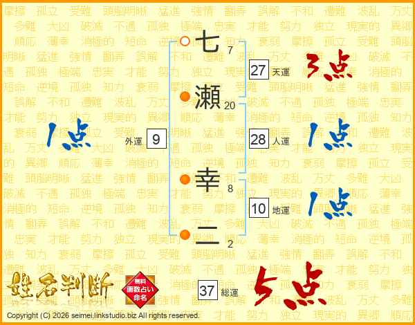 七(7画)瀬(20画) 幸(8画)二(2画)