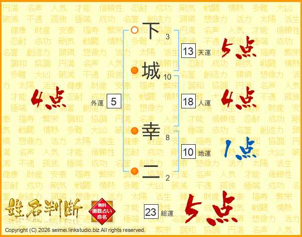 生活面を象徴する運勢です。外部から受ける影響力を表し、結婚運、家庭運や職場、環境への順応性を表します。総運から人運を引いた画数。姓や名が1文字の場合を除く。