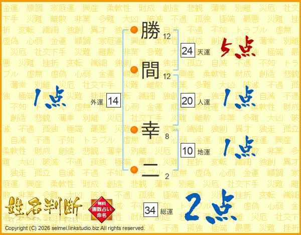 勝(12画)間(12画) 幸(8画)二(2画)