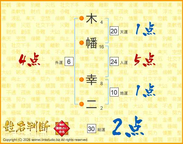 生活面を象徴する運勢です。外部から受ける影響力を表し、結婚運、家庭運や職場、環境への順応性を表します。総運から人運を引いた画数。姓や名が1文字の場合を除く。