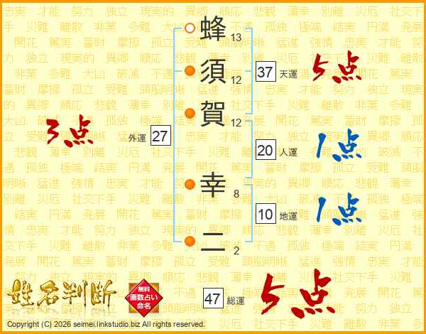 蜂(13画)須(12画)賀(12画) 幸(8画)二(2画)
