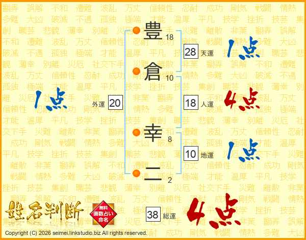 豊(18画)倉(10画) 幸(8画)二(2画)