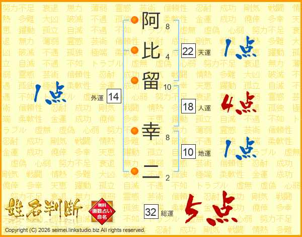 阿(8画)比(4画)留(10画) 幸(8画)二(2画)
