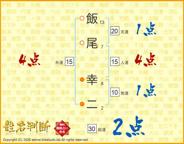 飯(13画)尾(7画) 幸(8画)二(2画)