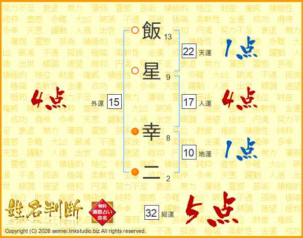 生活面を象徴する運勢です。外部から受ける影響力を表し、結婚運、家庭運や職場、環境への順応性を表します。総運から人運を引いた画数。姓や名が1文字の場合を除く。