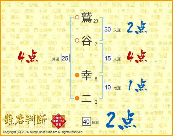鷲(23画)谷(7画) 幸(8画)二(2画)