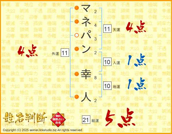 マ(2画)ネ(4画)パ(3画)ン(2画) 幸(8画)人(2画)