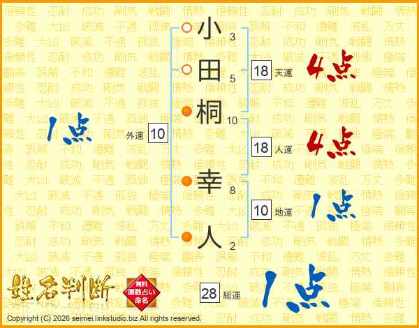 小(3画)田(5画)桐(10画) 幸(8画)人(2画)