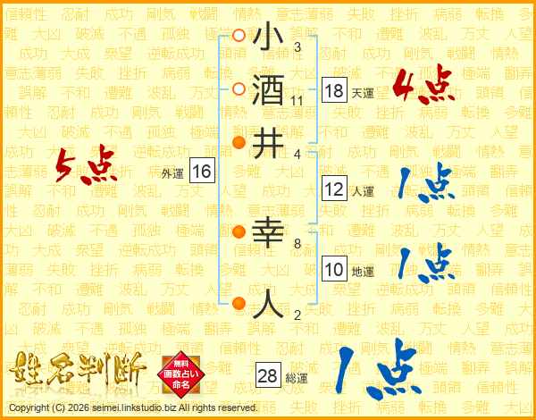 小(3画)酒(11画)井(4画) 幸(8画)人(2画)