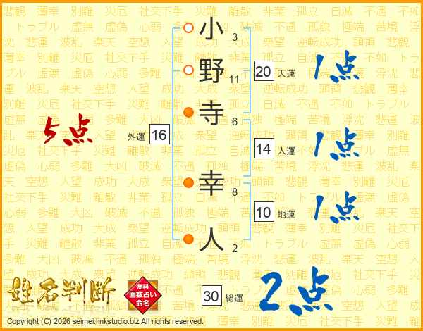 小(3画)野(11画)寺(6画) 幸(8画)人(2画)