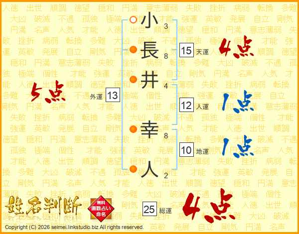 小(3画)長(8画)井(4画) 幸(8画)人(2画)