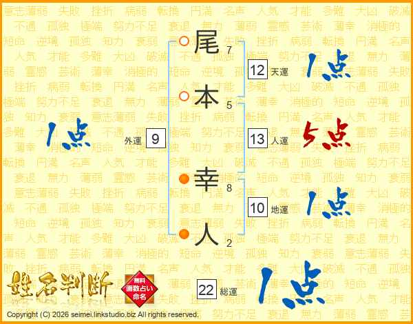 尾(7画)本(5画) 幸(8画)人(2画)