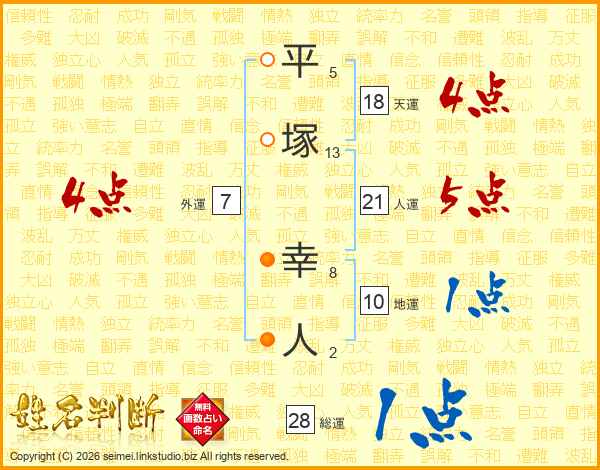 あなたの人生を表す1番重要な運勢です。生涯を通じて影響する総合運となり、主に50歳以降の晩年期に影響を及ぼします。苗字と名前の合計画数。