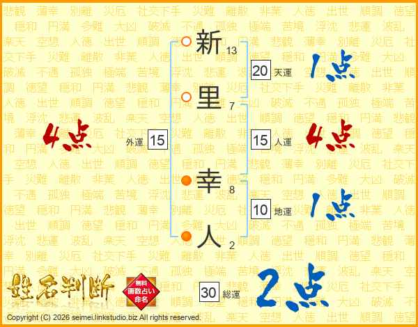 生活面を象徴する運勢です。外部から受ける影響力を表し、結婚運、家庭運や職場、環境への順応性を表します。総運から人運を引いた画数。姓や名が1文字の場合を除く。