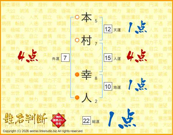 あなたの人生を表す1番重要な運勢です。生涯を通じて影響する総合運となり、主に50歳以降の晩年期に影響を及ぼします。苗字と名前の合計画数。