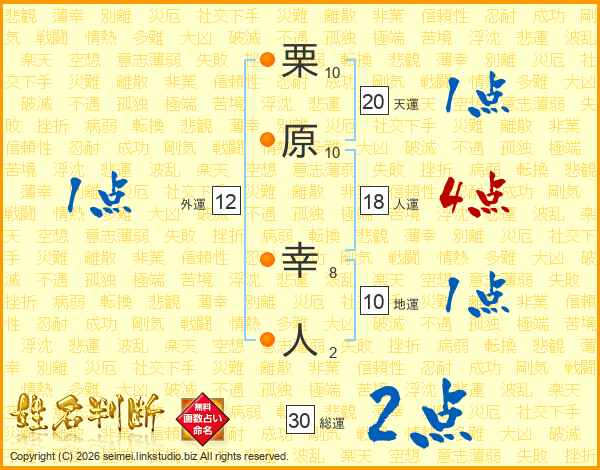 あなたの人生を表す1番重要な運勢です。生涯を通じて影響する総合運となり、主に50歳以降の晩年期に影響を及ぼします。苗字と名前の合計画数。