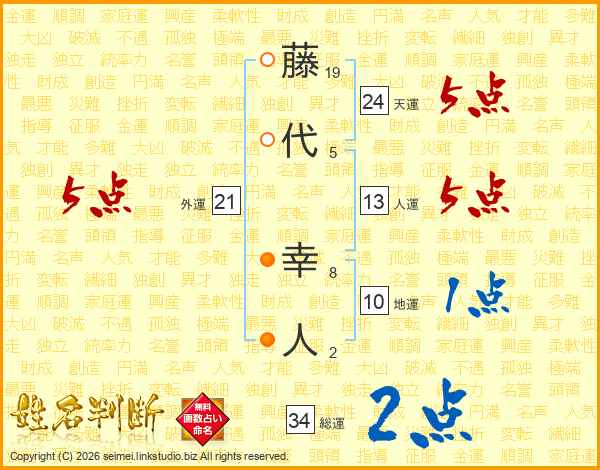 あなたの人生を表す1番重要な運勢です。生涯を通じて影響する総合運となり、主に50歳以降の晩年期に影響を及ぼします。苗字と名前の合計画数。