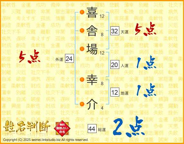 喜(12画)舎(8画)場(12画) 幸(8画)介(4画)