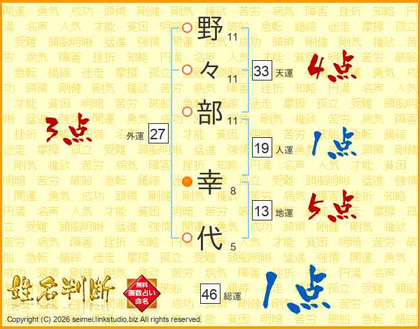 野(11画)々(11画)部(11画) 幸(8画)代(5画)