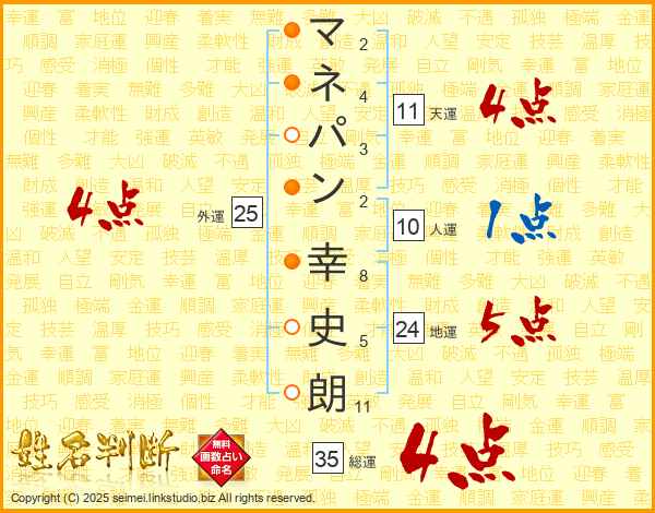 マ(2画)ネ(4画)パ(3画)ン(2画) 幸(8画)史(5画)朗(11画)