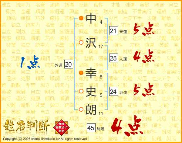 中(4画)沢(17画) 幸(8画)史(5画)朗(11画)