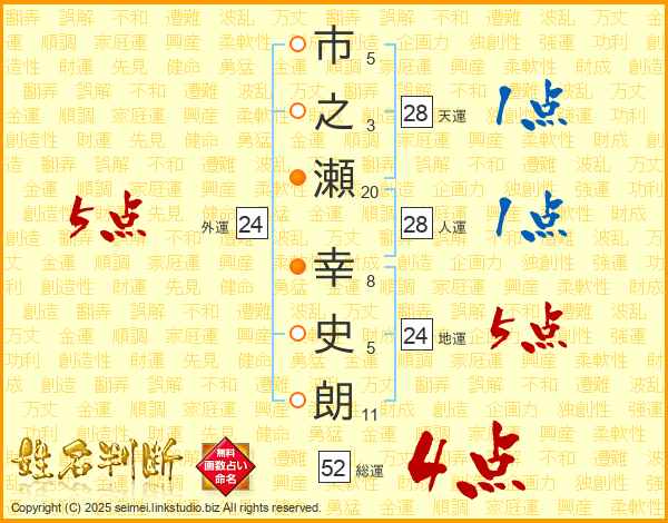 市(5画)之(3画)瀬(20画) 幸(8画)史(5画)朗(11画)