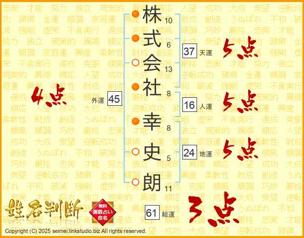 株(10画)式(6画)会(13画)社(8画) 幸(8画)史(5画)朗(11画)