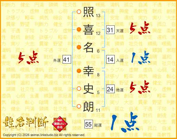 照(13画)喜(12画)名(6画) 幸(8画)史(5画)朗(11画)