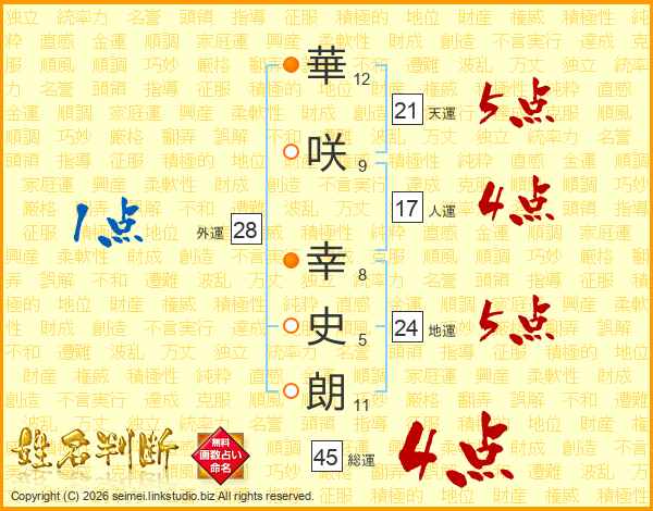 華(12画)咲(9画) 幸(8画)史(5画)朗(11画)