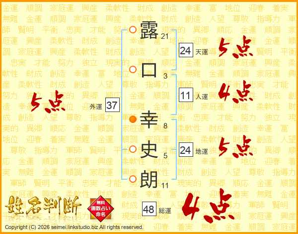 露(21画)口(3画) 幸(8画)史(5画)朗(11画)