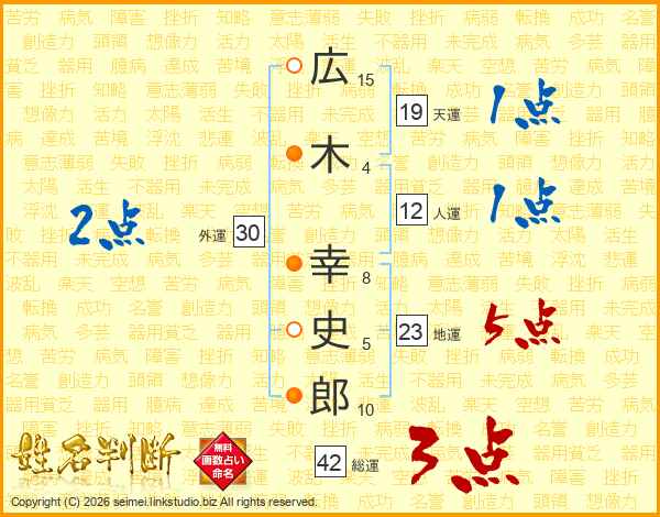 広(15画)木(4画) 幸(8画)史(5画)郎(10画)