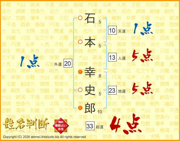 石(5画)本(5画) 幸(8画)史(5画)郎(10画)