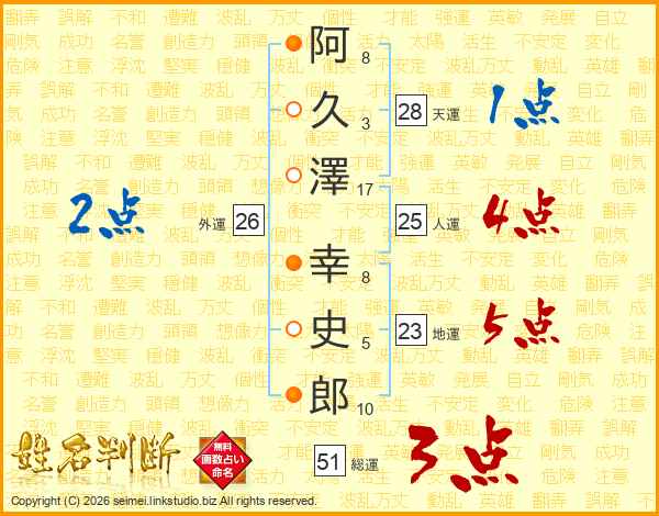 阿久澤幸史郎さんの地運は23画の5点!
