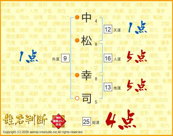 あなたの人生を表す1番重要な運勢です。生涯を通じて影響する総合運となり、主に50歳以降の晩年期に影響を及ぼします。苗字と名前の合計画数。