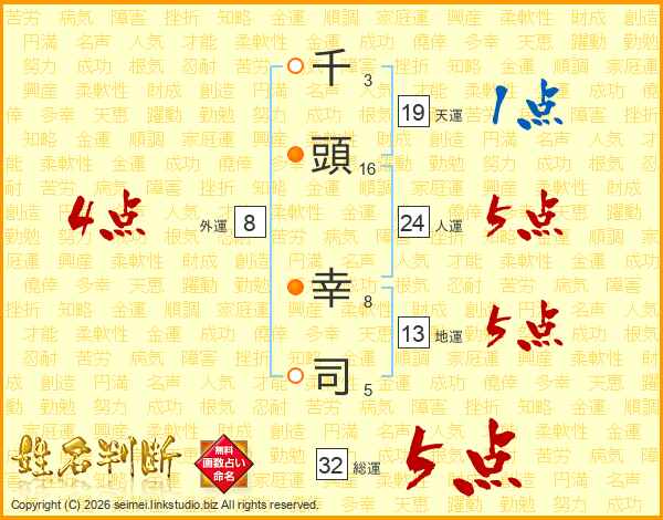 生活面を象徴する運勢です。外部から受ける影響力を表し、結婚運、家庭運や職場、環境への順応性を表します。総運から人運を引いた画数。姓や名が1文字の場合を除く。