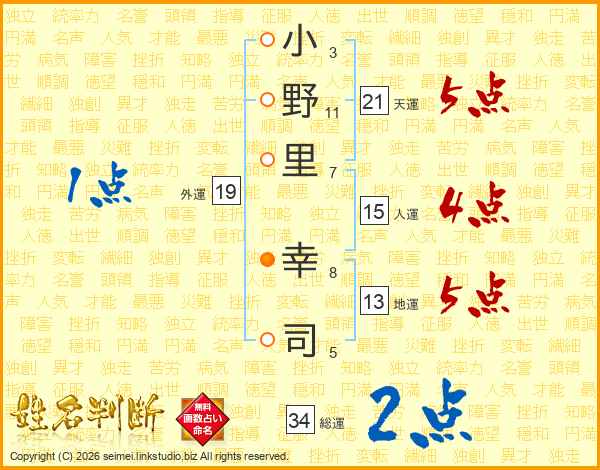 小(3画)野(11画)里(7画) 幸(8画)司(5画)