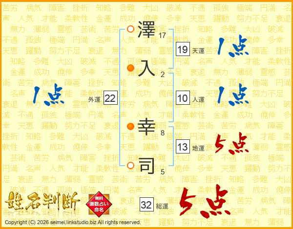 澤(17画)入(2画) 幸(8画)司(5画)
