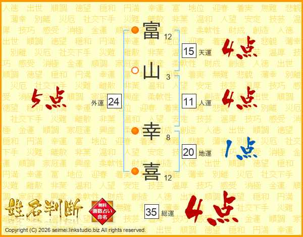 生活面を象徴する運勢です。外部から受ける影響力を表し、結婚運、家庭運や職場、環境への順応性を表します。総運から人運を引いた画数。姓や名が1文字の場合を除く。