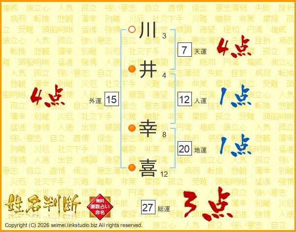 川(3画)井(4画) 幸(8画)喜(12画)